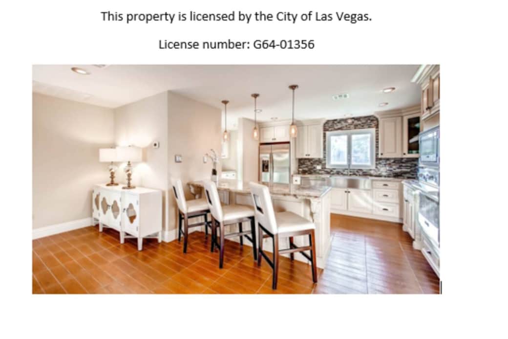 Welcome to this stunning and expansive 4-bedroom, 3.5-bathroom home! With over 4000 sq ft of space, this beautiful abode offers ample room for you and your guests to relax and unwind. The maximum occupancy for this home is 8 people, ensuring a comfortable stay at any time of day or night. Featuring three living rooms, including one off the primary bedroom, one in the center of the home, and another next to the bar, there's plenty of space for everyone to spread out and enjoy. The large bar area is perfect for entertaining, complete with a foosball table and easy backyard access to the luxurious swimming pool and spa. Step outside to the completely private backyard oasis, adorned with lush landscaping for the ultimate retreat experience. Gas heat for the pool is available at a rate of $95 per day (must be booked for the entire duration of trip). Please note, I do not rent to Las Vegas locals. Rest assured, this vacation rental is fully licensed with the city of Las Vegas, with license number G64-01356. Booking with a licensed vacation rental ensures a safe and legal stay, so you can relax and enjoy your time in Las Vegas worry-free!